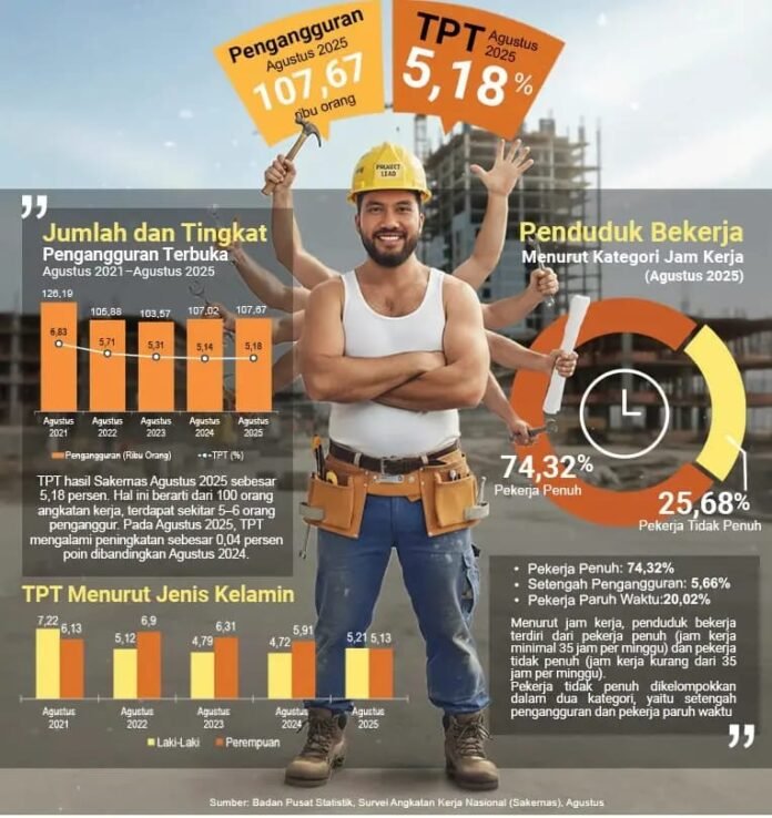 Pada Agustus 2025, tingkat setengah pengangguran laki-laki mencapai 5,86 persen, sedangkan perempuan 5,29 persen. Keduanya meningkat dibanding tahun sebelumnya—masing-masing 0,88 dan 1,38 persen poin.