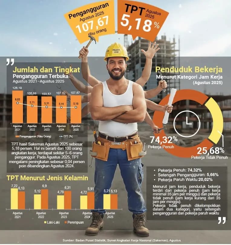 Dalam dua tahun terakhir, tingkat setengah pengangguran naik 1,17 persen poin (2023–2024) dan kembali naik 1,05 persen poin pada 2025.