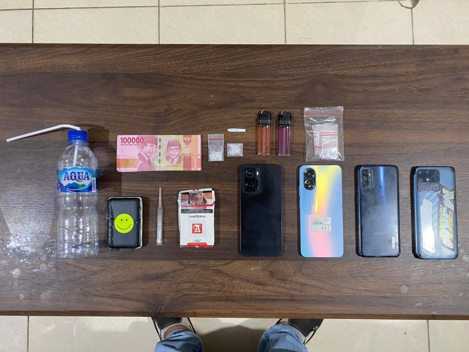 Saat dilakukan penggeledahan badan dan pakaian, petugas menemukan dua bungkus narkotika jenis sabu dengan berat kotor 1,90 gram. Selain itu, sejumlah barang bukti seperti alat hisap, sendok takar, dan pipet kaca turut disita oleh pihak kepolisian.